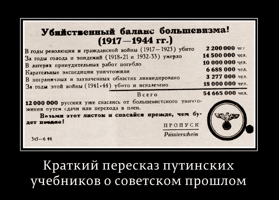 Об этом говорят сразу два факта: переписанный учебник послевоенной истории СССР и постсоветской России, где СССР внезапно перестал быть тоталитарным режимом и угрозой человечеству, как было прописано ранее в полном соответствии с книгами Солженицына и листовками Геббельса времен Великой Отечественной: