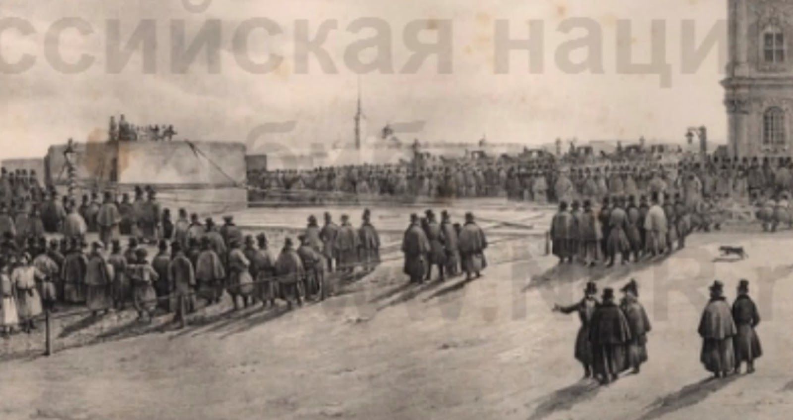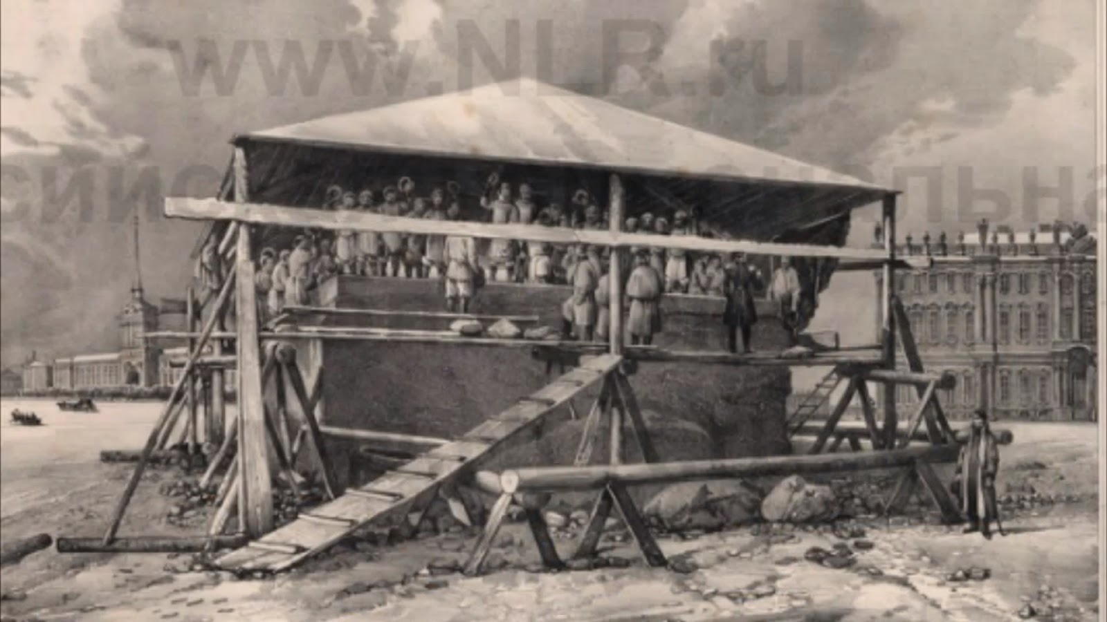 ( видео отсутствует ) Ну как вам соревнование "Чья история появления колонны круче?" В официальной версии победил Монферан, но его метод ой как спорен: Постройте из спичек помост, а потом прокатите по нему пудовую гирю... выдержит? Я уже о технологии подъёма молчу, математическая модель такой операции не выдерживает никакой критики. Так кому верить? При всём при этом не стоит забывать, что вес обработанной колонны составил около 700 тонн, сколько тогда весила заготовка под неё? Кто и когда обрабатывал такие монолиты? Где завод, документация, мастера, автор наконец? Из чего сделан фундамент под такой вес? И сколько таких... или чуть поменьше колонн в Питере? О создателе колонн читайте тут: Суханов Самсон Семёныч-Ксенофонтыч А вот вам ещё одна, на мой взгляд, абсурдная ситуация. Садовников не зная о мучениях Монферана рисует то, что видит, то что есть на самом деле. Обратите внимание на год, колонна стояла, стоит и стоять будет. А вот вам Литография К. П. Беггрова. 1830 год. Очень информативной в плане нестыковок кажется вот эта картина. Рисунок из российских архивов Романовых. Странными для меня показались полоски на флаге Флаг государства Ольденбург (Мюнстерское князь-епископство нем. Hochstift Münster) Российский флаг выглядит вот так Александровская колонна в Санкт-Петербурге. Гравюра. 1835 г. Взято отсюда: Александровская колонна.Санкт-Петербург. Обратите внимание на фигуру "Ангела-Александра" похож? Радует ещё один рисунок Огюст Монферран. Увеличенный вариант, как было и как есть. Занимательно, да? По моему не в той руке ангел крест держит, змея пропала, а самое смешное, на заднем плане Исаакиевский собор стоит, а по официальной версии, к этому времени у Исаакия был был готов только первый этаж, а купол не мог появиться ранее 1837 года: в 1837 году, когда было завершено основание купола, началась установка 24 верхних колонн. Вот ещё один прокол Монферана 30 августа 1834 года. Парад в честь открытия Александровской колонны. Автор Огюст Монферан. А собор то стоит. Рисунки взяты с сайта государственной Российской библиотеки ОТСЮДА стр. 89.