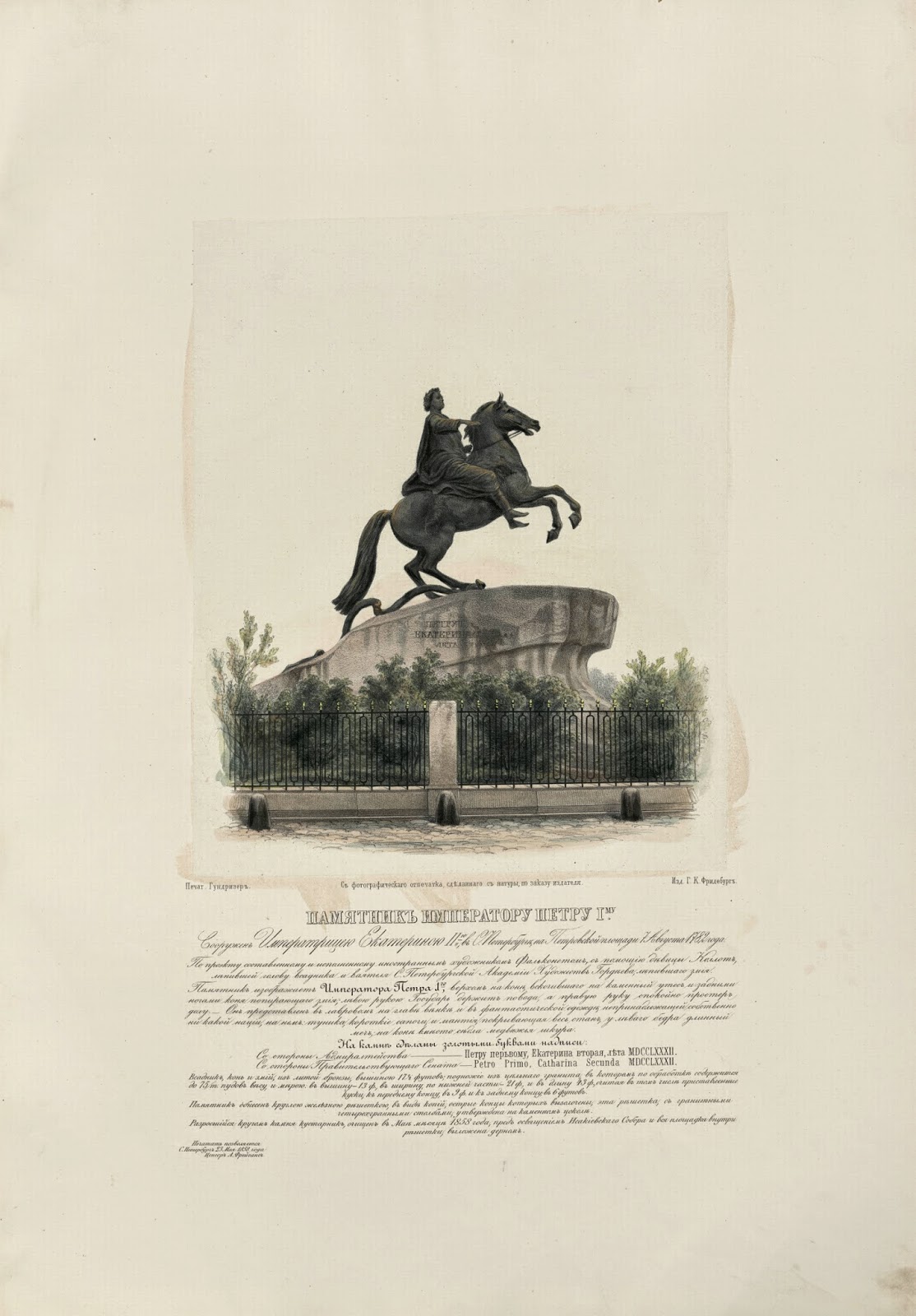 Иллюстрация из 11-го свитка «Канкай ибун». Памятник нарисован японским художником со слов допрошенных моряков, прибитых кораблекрушением к берегам России и через много лет возвращённых в Японию российским посольством во главе с Н. П. Резановым. В целом символику памятника можно было бы прочитать так: На гребне волны воин-освободитель побеждает Змея (низкие помыслы и действия), но это было не городским событием, и даже не событием страны, это было событием мирового масштаба. В памяти людской оставили лишь незначительные осколки, а само событие решено было сфальсифицировать. Где-то я такой памятник уже видел Очень интересна история замеров камня в разное время Повреждённый памятник сначала имел высоту камня 8,23м., но в 1769г. камень почему-то стал ниже на 2 с лишним метра, а в 1778 усох ещё на 2 метра (возможно начались реставрационные работы), и... с 1882 года (после окончательной доводки) высота его остаётся неизменной 8,20м. Обратим внимание на то, что сам автор Э.Фальконе говорит о высоте 6,10м, а кому как не автору знать точную высоту, или Фальконе был не в курсе реальной высоты памятника? Цитирую: Грамота Александра Фїлїпповiча Македонского въ своё время была известна многимъ образованнымъ людямъ Планеты, которые её неоднократно упоминали въ своихъ устныхъ высказыванiяхъ и письменныхъ трудахъ. Но более целостный текстъ приведёнъ въ книге: «Исторiографiя початiя имене, славы и разширенiя народа славянского, и ихъ царей и владетелей подъ многими имянами, и со многими царствiями, королевствами, и провинцiами». Собрана изъ многихъ книгъ историческихъ, чрезъ господина Мавроурбина архимандрита Рагужского. СПб. 1722. Именно этотъ текстъ мы и попробуемъ прокомментировать для не спецiалистовъ. Справка: Также подобный текстъ былъ опубликованъ: • Вацлавомъ Гайкомъ, Iосифомъ Первольфомъ (нашедшимъ копiю на латинскомъ языке); • Маркинымъ Вельскимъ (Хроники всего мира 1551 г.); Упоминанiе объ этой Грамоте есть въ: • книге Ломоносова Михайло Васильевича (Древняя Россiйская Исторiя); • документахъ Екатерины Великой (Записки касательно Россiйской исторiи); • книге святого Дмитрiя Ростовского (Летопись, сказующая въ кратце отъ начала миробытiя до рождества Христова). Въ энциклопедической литературе Мавро Орбини (хорв. Mavro Orbin, итал. Mauro Orbini) (? — † 1614), родомъ изъ Рагуза, ныне Дубровникъ — хорватскiй историкъ (Дубровницкая республика), родоначальникъ югославянской исторической науки, выразитель идеи единства славянского мира. Но его книга была написана на италiйскомъ (читай - итальянскомъ) языке, что говоритъ о томъ, что онъ итальянецъ изъ сицилiйского города Рагуза и къ славянамъ им?етъ косвенное отношенiе. Да и какая нужда славянину описывать Славянское царство? Саму книгу: «Исторiографiя початiя имене, славы и разширенiя народа славянского, и их цареи и владетелеи под многими имянами, и со многими царствiями, королевствами, и провинцiами» мы можемъ найти въ Россiйской (Румянцевской, Ленинской) Государственной библiотеке ». «Мы Але[кс]андръ Фїлїпповiчь, Царь Македонскїй, Государь Монархїи, изобразїтелный начатель державства греческаго, Велїкаго Дїабога сынъ чрезъ натавана возвещенъ обладатель Августовъ, и брахмановъ, и арбоновъ, отъ Восхода Солнечнаго, даже до Запада, отъ Полудни до Севера, благороднои породе славянъ, и ихъ языку, мїлость мире, и здравїе отъ насъ, и отъ 