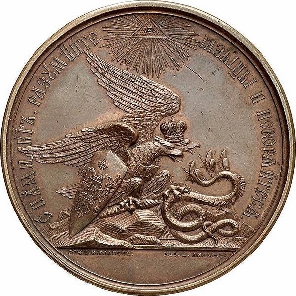 Посмотрите на вот эти фото Внимательно присмотритесь к тому, что у ангелов в руках... Мне показалось, что крест на александровской колоне смотрится не очень гармонично, а вот огненный мечь просится в руку ангела сам по себе. Не могу сказать, что я хороший художник, но я попробую себе это представить. Или к примеру вот так Больше картинок тут Возвращаюсь к самой колонне, она тоже болела, внимательному глазу удаётся рассмотреть следы ремонта. Возможно в 1834 году её не устанавливали, а открывали после реставрации, с новый скульптурой наверху и заплатками в основе (подробный разбор ниже по тексту). Обновили и панно у основания, добавив к римским богам и богиням элементы русского оружия и доспехов. Что-что а переделывать старые памятники мы научились, и прав был Г.Г.Гагарин рисуя Александровскую колонну в лесах в 1832 году. Александровская колонна в лесах. (Grigory Gagarin. Column of Alexander I of Russia in scaffolds. Saint Petersburg). С 1832 до 1833 гг. А вот вам и памятная серебряная медаль. Учрежденная в 1812 году. Одинаковая для всех. И для ополченцев, и для солдат, и для генералов. Опять возникает вопрос: кто же всё таки тогда победил? А вот ещё одна медаль «За взятие Парижа 14 марта 1814 года.» ...ещё один глазик. Медаль "За защиту Севастополя 1854-55гг". Вот тут, на сайте "Живая история" очень интересная точка зрения на события 1812 года: «Скажи-ка, дядя, ведь не даром, Москва спаленная пожаром...» Для тех, кому не безразлична наша история, стоит ознакомиться. Недавно наткнулся на интереснейшую книженцию, находящуюся в архивах Российской государственной библиотеки "О том, что Наполеона никогда не было", дата выпуска 1912 год, выводы делайте сами. Очень интересна в этом плане и работа Андрея Стамболи "Московский набег Наполеона". Выложу ещё одну заковырку. Кто сказал, что Наполнена разбили в 1812 году? Вот документ, согласно которого боевые действия велись вплоть до 1815 года. И по этой книжке не совсем понятно, кто же там победил. Вы скажете, мало письменных источников, соглашусь, их уничтожили. Россия в 19 веке была не столь неграмотна, как кажется. Какое агенство могло похвастаться возможностью печати объявлений во всём мире? Скажите невероятно, смотрите сами. Стоит обратить внимание и на изменение герба России после войны 1812 года. Вот таким он был до неё при императоре Павле I. Все символы государственной власти, а именно скипетр и держава присутствуют, крылья орла гордо расправлены вверх: свидетельство свободы и независимости. ... а вот таким он стал, после, так называемой победы 1812 г. при Александре I. Может не зря Александр I подстроил свою смерть и бежал. Исчезли символы власти, крылья опущены, в когтях орла венок и стрелы, убранство явно не имперское. А вот до такого герба Россия дошла при временном правительстве. Птичка с двумя головами, не более. Но всё возвращается на круги своя... Нынешний герб Имрерии Вот тут подробная ссылка о всех изменениях в гербе государства Российского. Герб России или тут Государственный герб России - - - Копируя статью, не забывайте указывать авторство. Адрес полной версии тут: "Откуда город? (автор ZigZag)" | ||||||||||||||||||||||||||||||||||||||||||||||||||||||||||||||||||||||||||